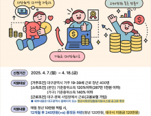 - 대구광역시는 사회진입 초기의 일하는 청년들에게 소액자산 형성 경험과 기회를 마련해 주기 위해 ‘2025년 청년희망적금’ 사업을 추진하고 참여자를 모집한다.대구광역시 청년희망적금 사업은 지역에서 일하는 청년이 120만 원을 저축(10만 원×12개월)하며 8개월…