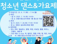 - 포항시청소년재단(대표이사 최제민) 청소년수련관은 지역 청소년들의 재능과 열정을 마음껏 펼칠 수 있는 ‘2025년 제27회 청소년 댄스&가요제’의 참가자를 모집한다. 이번 대회는 청소년들이 직접 준비한 음악과 댄스 공연으로 끼와 실력…